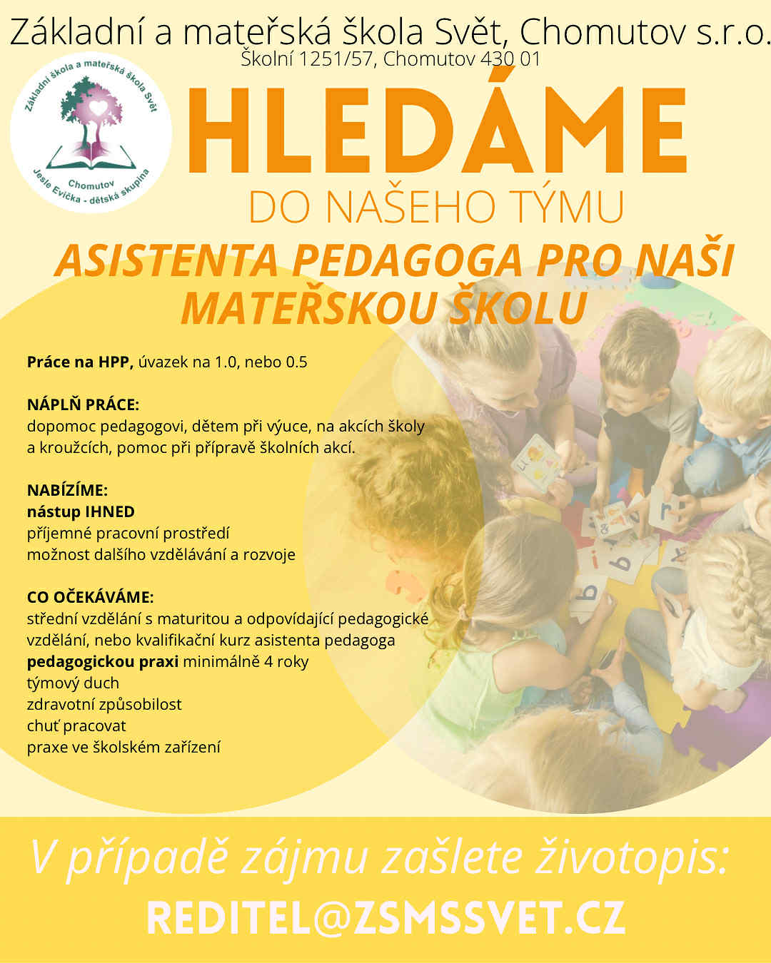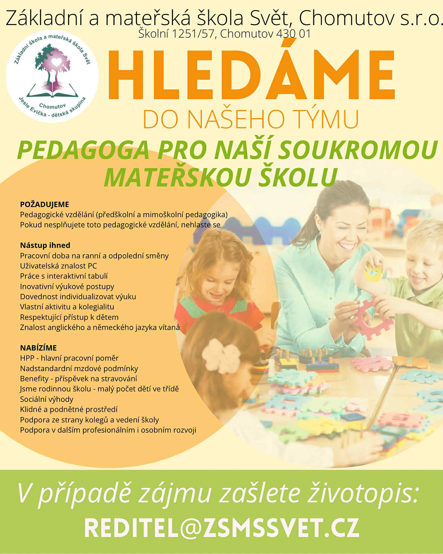 › Projekty › Pracovní nabídka: Přidejte se k našemu týmu!Základní a mateřská škola Svět, Chomutov s.r.o. hledá nové kolegy a kolegyně, kteří s námi chtějí vytvářet podnětné, laskavé a přátelské prostředí pro naše děti.